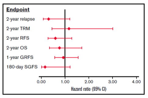 There were no differences in neutrophil or platelet engraftment, severe chronic GVHD, CMV or EBV viral infections, TRM, relapse, or RFS (see Figure 1B), GVHD free/relapse-free survival (GRFS) and OS between the groups. Severe acute GVHD (grades 3-4) (see Figure 1A) and SGFS were significantly lower in the MMUD/abatacept group compared to MUD/standard of care group. Multivariate analysis controlling for differences in patient age, performance score, disease stage, graft type and conditioning regimen between the groups did not impact these results (see Figure 2). The combined results in the following figures suggest that the addition of abatacept to standard CNI/MTX mitigates the disadvantages of mismatching by greatly reducing the risks of severe acute GVHD and non-relapse mortality without increasing the risk of relapse.
