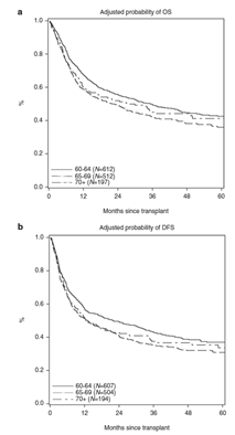 Differences in outcomes were better explained by covariates other than age. Increasing age is associated with a small decrease in OS after transplant, which is smaller than that due to other disease-related risk factors. The impact of increasing age on outcomes showed that all age groups achieved 3-year overall survival of 40-50%. The median follow-up of survivors was nearly 3 years.