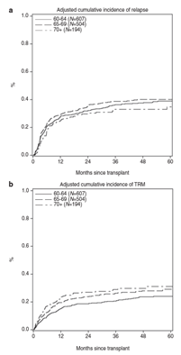 This study included 1,321 patients with AML 60 years and older who received an allogeneic HCT in CR1 from 2007 through 2017. Patients were split into three categories by age (60-64 years, 65-69 years, and 70 years old or older) with comparable clinical characteristics and comorbidities.
