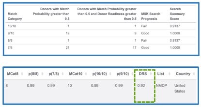 In a retrospective validation process, the study team found 105 cases common to both BTM-SP and MSK-SP measures where they estimated ‘Good’ or ‘Very Good’ chances of finding an 8/8 donor, but the patient was instead transplanted with a 7/8 donor. In 63% of these cases, the SSS was correct at identifying the need for a less than full match. In cases of difficult searches, the improved accuracy of the SSS tool may encourage physicians to pursue multiple treatment options simultaneously to ensure there are no unnecessary delays, especially since timing can be critical to patient outcomes. The below figure shows how adding the DRS into the SSS tool changed what would be considered a ‘Fair’ search by MSK to a high likelihood of finding a fully matched donor.